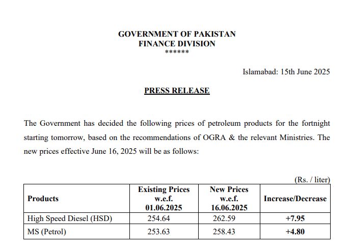 Today the government has announced a Blow to Pakistanis as the government approved a sharp increase in petrol prices and increased the rate of Diesel Price as well raising the cost of petrol by Rs4.80 to Rs 258.43 per litre for the second half of June 16, 2025.